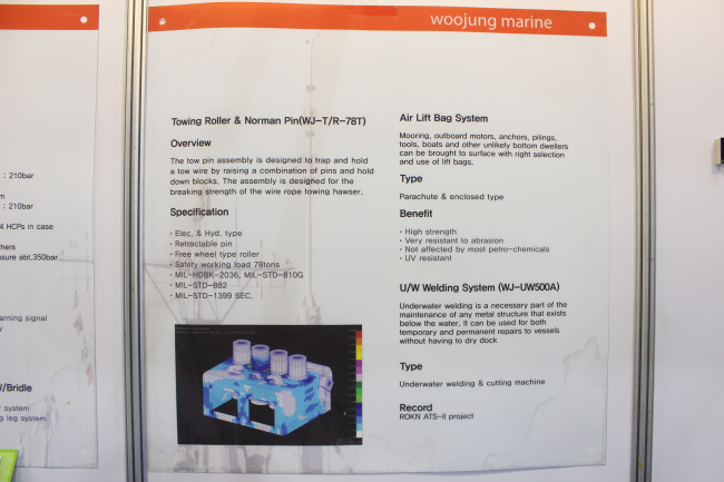 | 전화번호 | 051-418-7666 | 전시품목 | · 잠수함용 메신져 부이 - 한국형 장보고-III 잠수함 · 잠수함용 평형수 토출 시스템 -인도네시아 잠수함 · 잠수함용 앵커링 시스템 - 인도네시아 잠수함 · 잠수함용 볼라드/호져 - 한국형 장보고-III 잠수함 · 잠수함용 THROTTLE FLAP-인도네시아 잠수함 · 잠수함용 배터리실 이송장치(BATTERY SERVICE FACILITY)-인도네시아 잠수함 |
