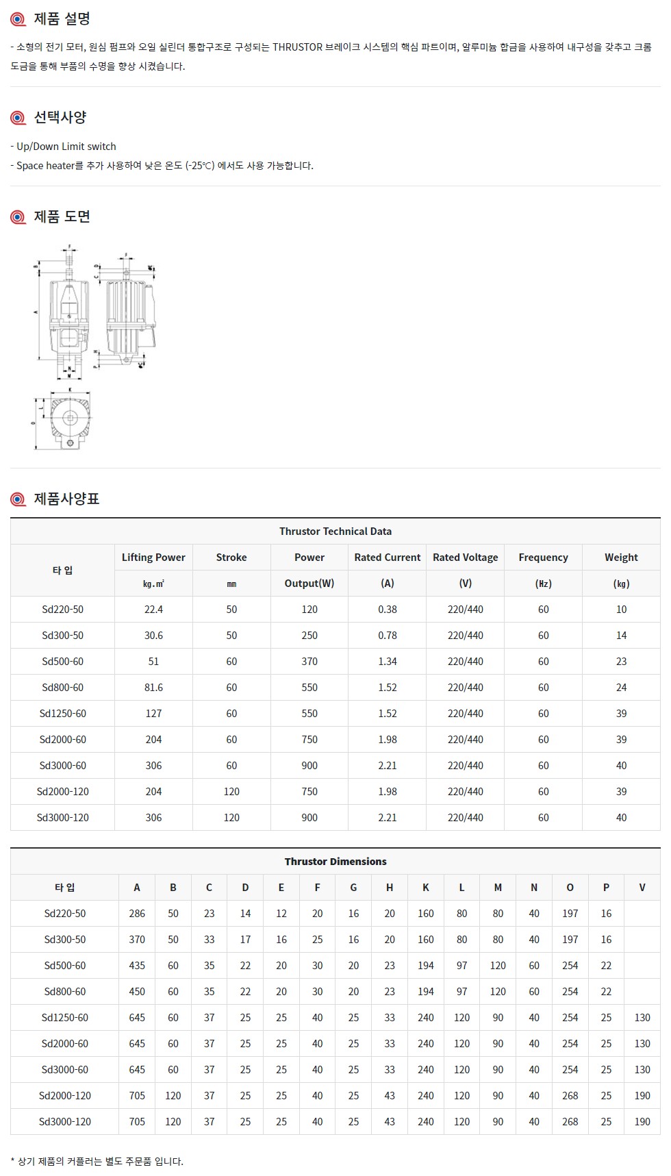 - 소형의 전기 모터,원심 펌프와 오일 실린더 통합구조로 구성되는 THRUSTOR 브레이크 시스템의 핵심 파트이며,알루미늄 합금을 사용하여 내구성을 갖추고 크롬 도금을 통해 부품의 수명을 향상 시켰습니다.