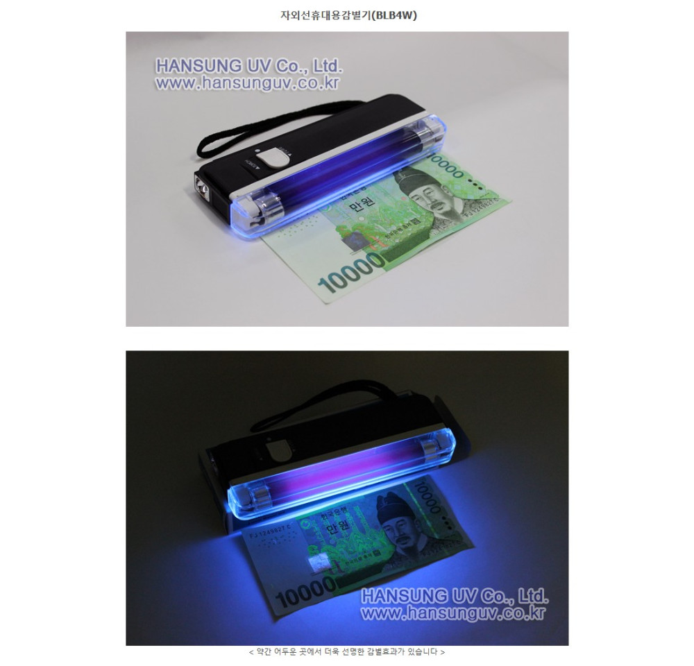 Product name ultraviolet portable discriminator lamp specification BLB4W (F4T5 BL/TL4W BLB) Features○ Easy to carry.○ It uses batteries as a power source, so it can be used anywhere (Alkaline AA *4) ○ It is used for various discriminations. - Identification of counterfeit bills - Identification of counterfeit gift certificates, - Identification of counterfeit documents - Fluorescent substance reactions, etc.○ It can also be used as a regular flash.<br>