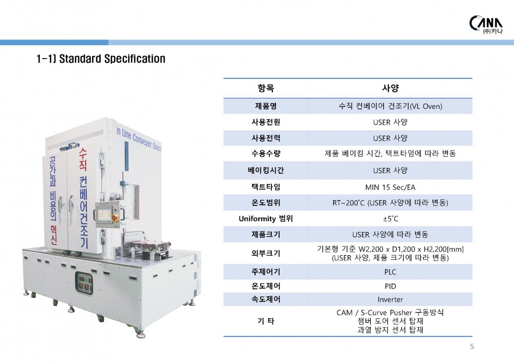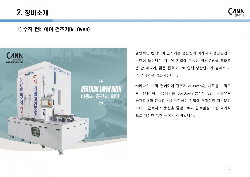 ㈜카나의 수직 컨베이어 건조기(VL OVEN)는 시료를 수직으로 적재하여 이송시키는 Up-Down 방식의 Cam 구동으로 공간활용과 전력감소를 구현하여 기업에 경제적인 이익뿐만 아니라 근로자의 동선을 줄임으로써 근로환경 또한 획기적으로 개선한 특허 등록된 장비입니다.