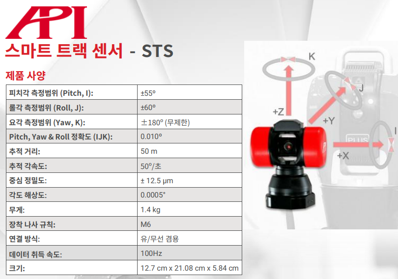 6DoF continuous displacement measurements of robots, factory machines, rails, and rotating vehicles without laser-beam disconnection. Multiaxial motion, 6D (X,Y,Z,i,j,k) continuous measurements without laser beam disconnection when measuring rotational motion.It is a more liberal measurement using wireless STS targetsTarget features and advantages required for performance measurement/evaluation/calibration such as axial machine tools, multi-axis robots, and RDS