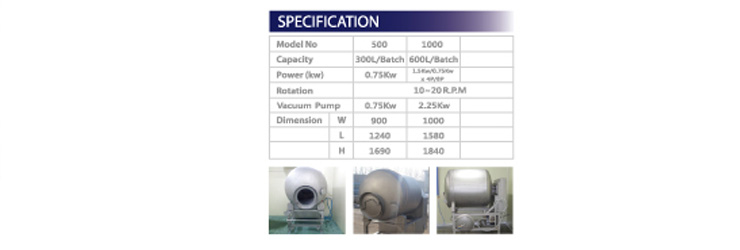 맛사지 기능과 염지의 원활함으로 질과 맛이 좋아지며 대용량 처리가능 기계운전이 용이하다. 오리,닭,족발,칠면조 삽겹살 등 모든 육가공 염지에 사용된다