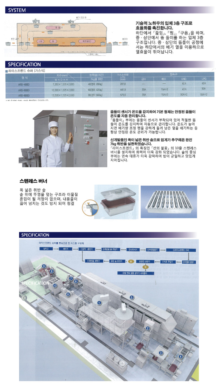 화력조정 기능을 추가하여 가스의 연소를 세밀하게 컨트롤 합니다. 취반기에 [뜸들이]기능을 추가하여 델리카 업계에서 바라던 완전 7Kg 취반을 실현하였습니다. 집중 배기와 단열 구조로 취반실의 환경개선에 성공하였습니다.